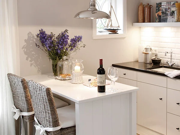 The 32 m2 Scandinavian-style „Offizier´s“ Apartment is equipped with a double bed, a kitchenette and a shower room. It makes an ideal island hideaway for two or as an extension to one of the two larger halves of the Jonggöntje House. The dining and living areas of this elegant holiday apartment are separate. It also has a separate entrance as well as a patio with garden furniture.